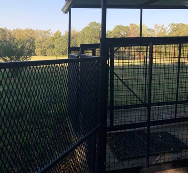 Our doggie visitors are comfortably housed in secure indoor-outdoor stalls. Each indoor and outdoor stall measures 4ft x 9.5ft. Indoor-outdoor stalls have an adjoining doggie door so pups can choose where they want to be throughout the day, but all dogs are safely locked indoors at night. Every few hours during the day, we offer each dog time to run and play and potty in our spacious fenced dog yard. Extended daily walks are also available.